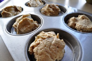 Preheat oven to 350 while you’re getting everything ready. Use a 9×5 inch loaf pan, lightly greased (or a hamburger bun pan).